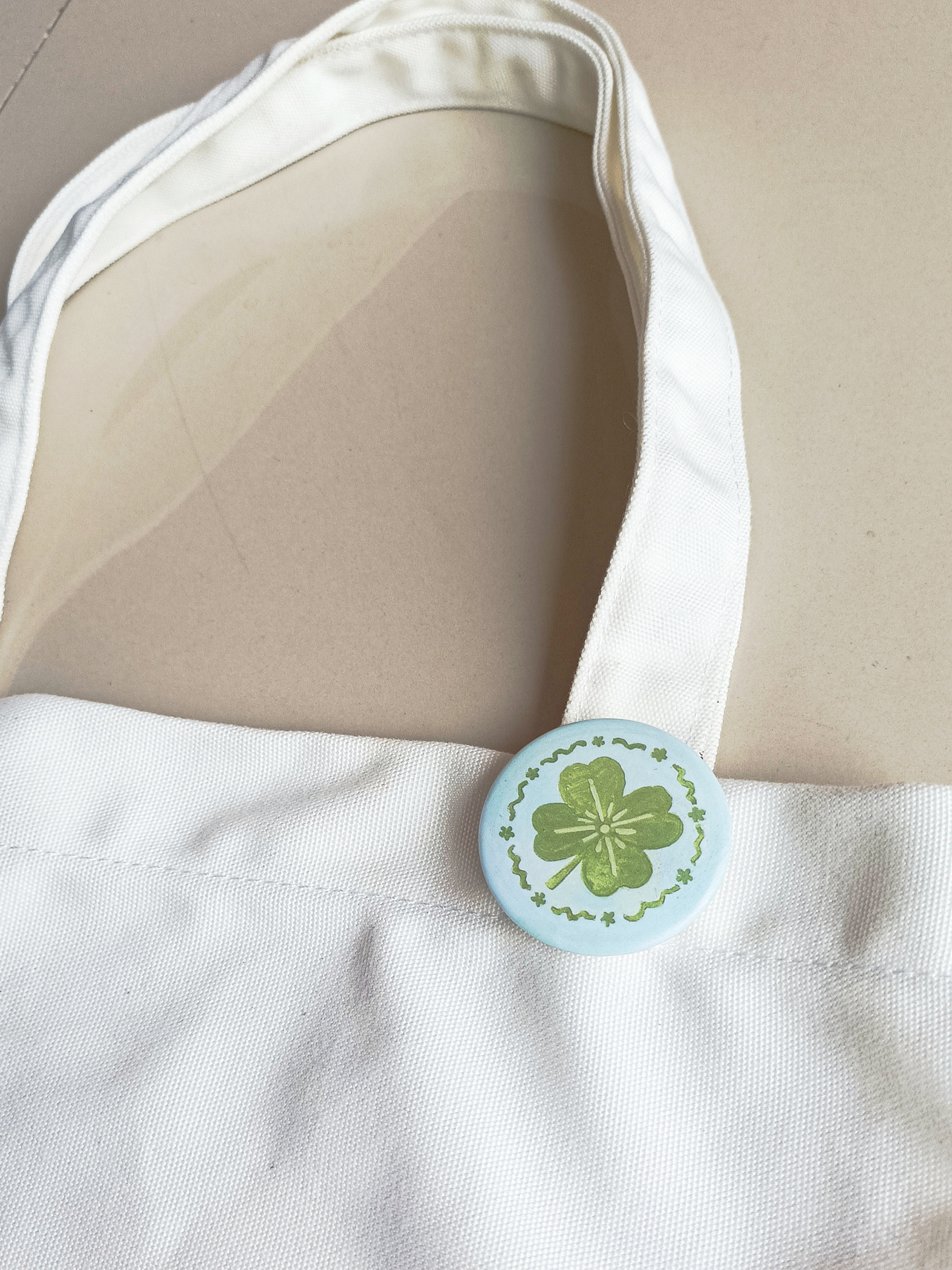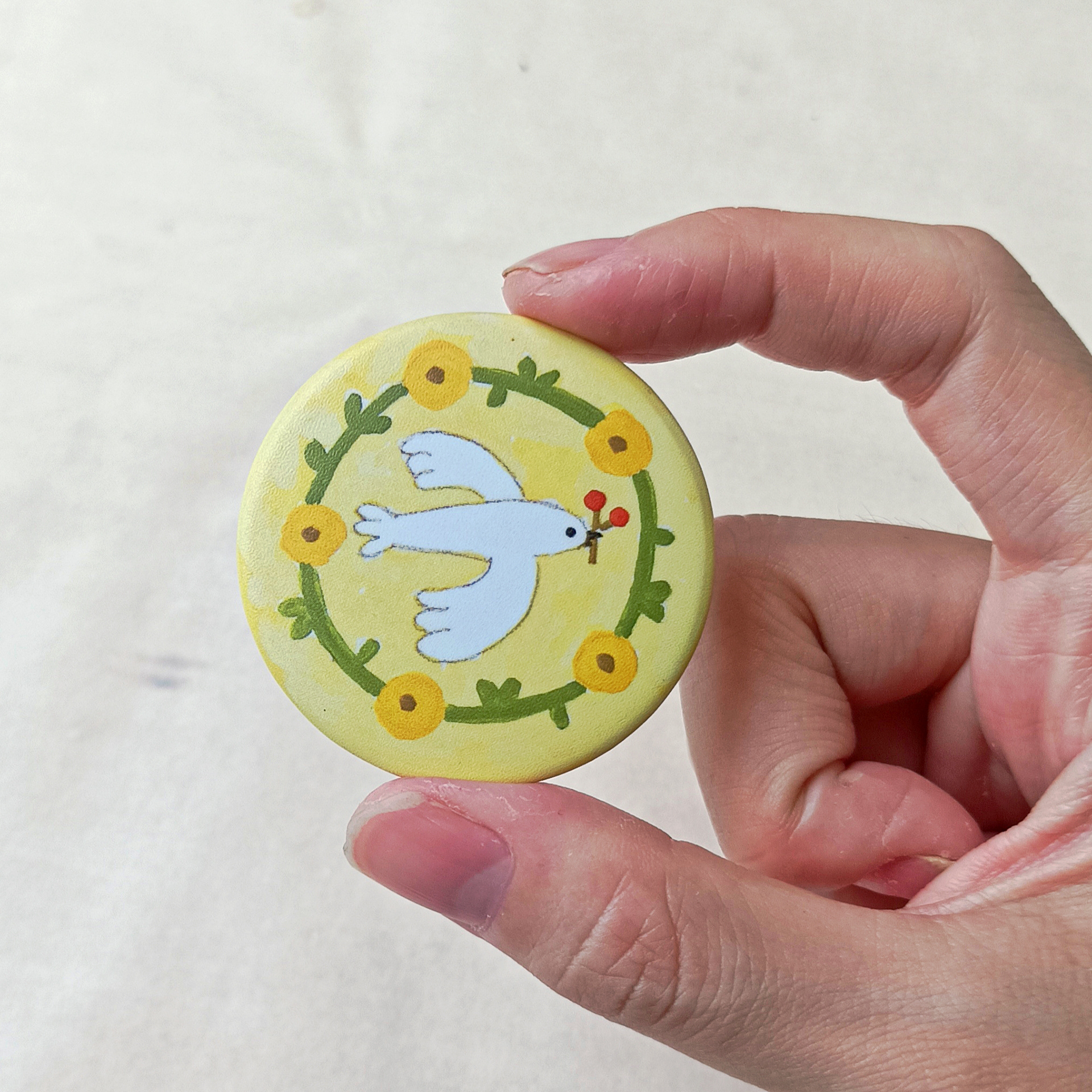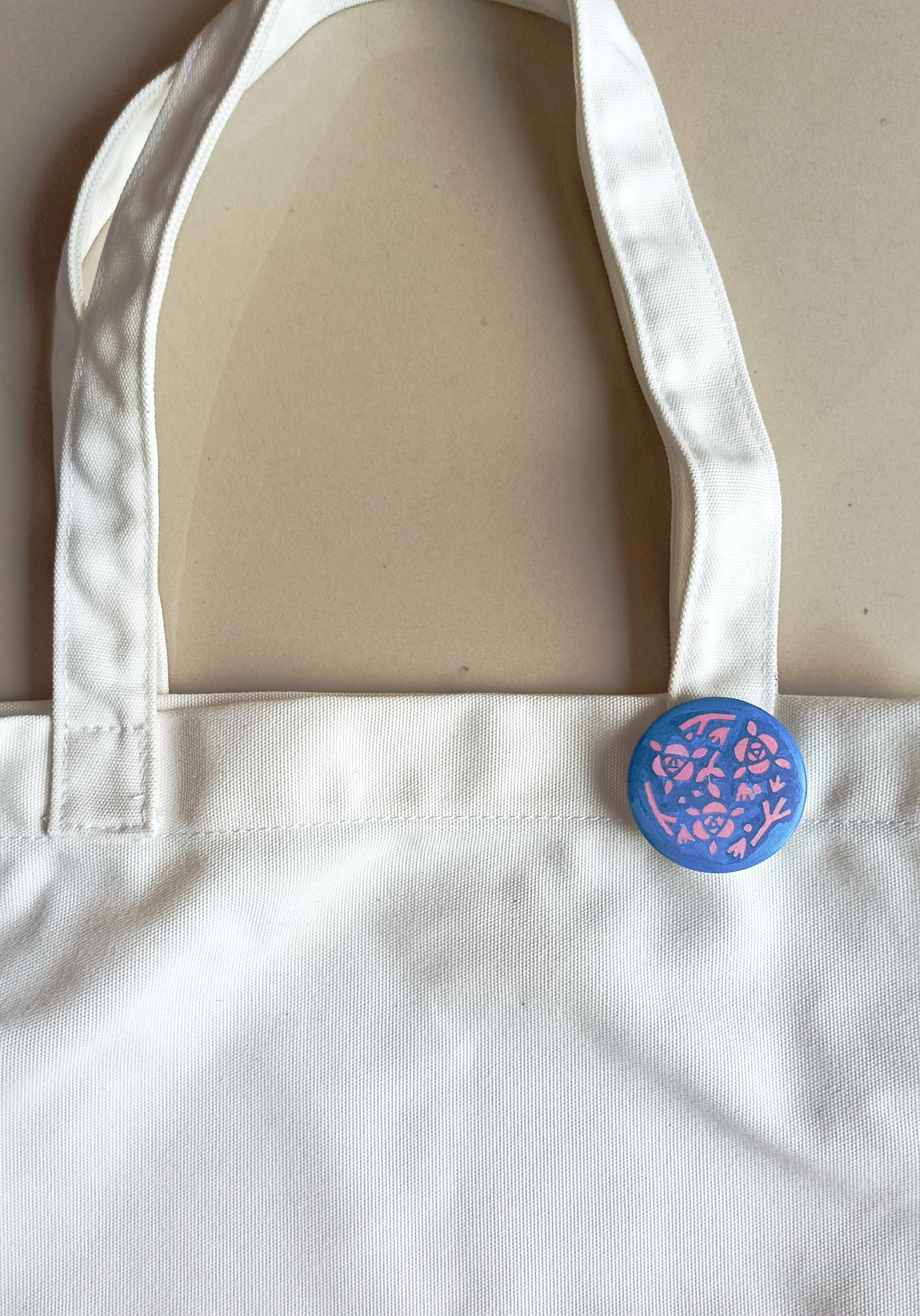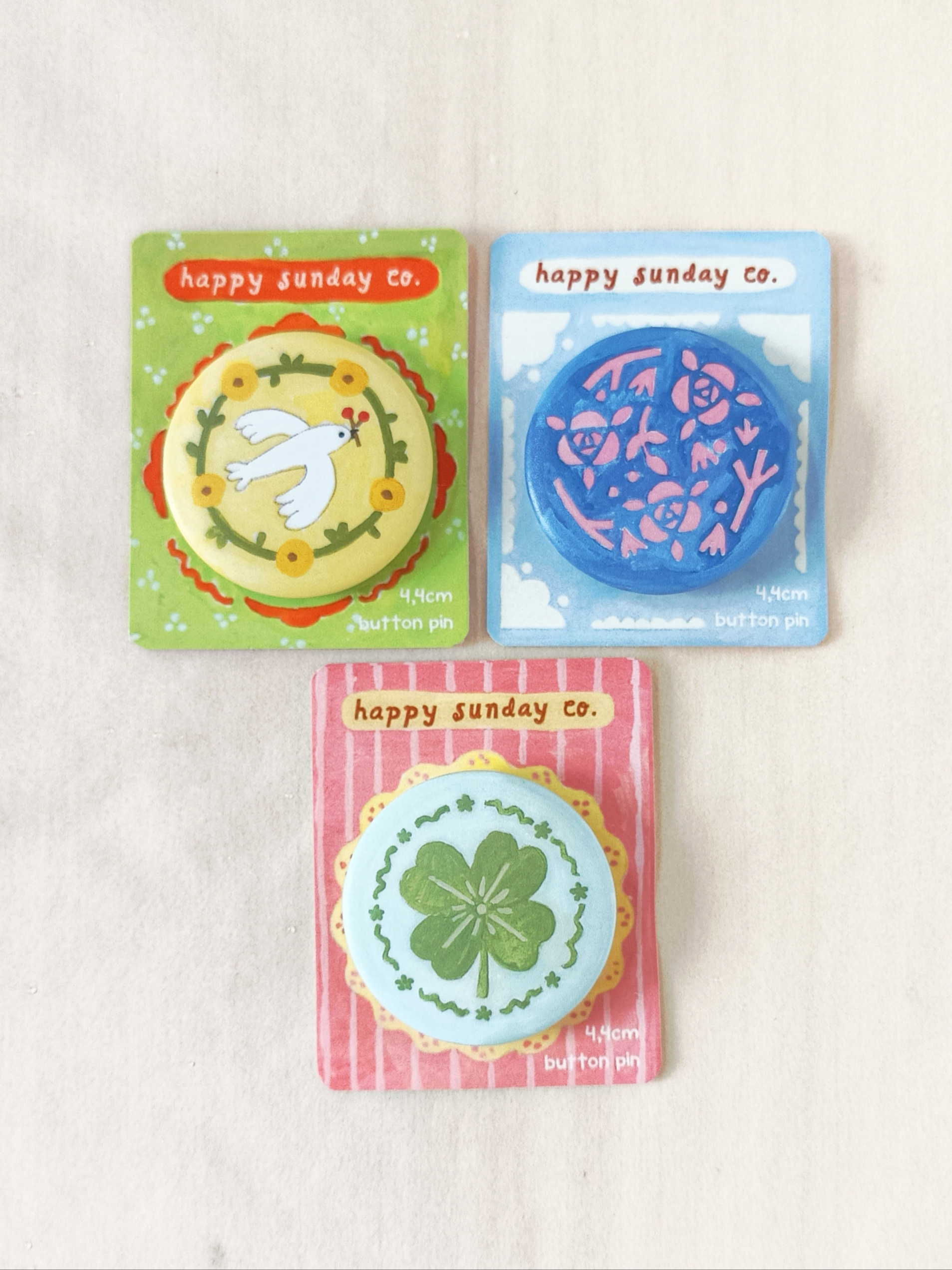 Each piece begins as a hand-drawn illustration on paper, then carefully scanned and printed on high quality paper turned into button pin.