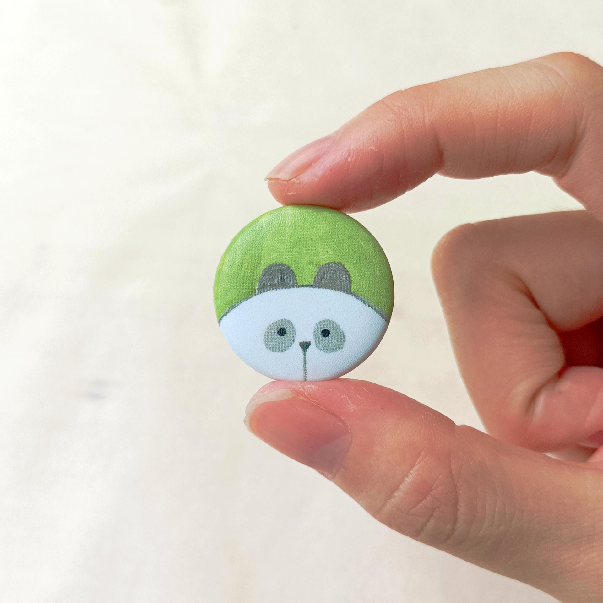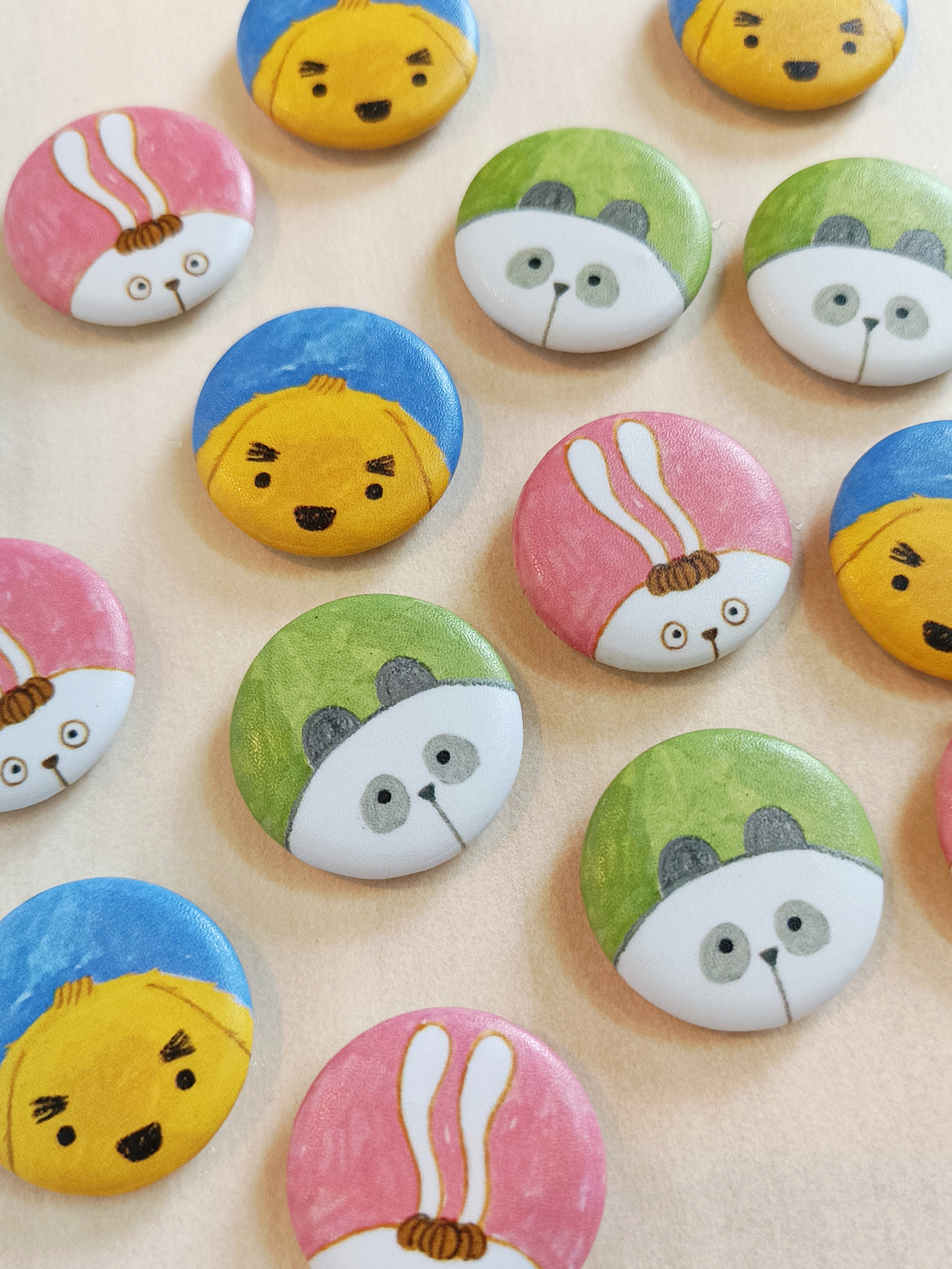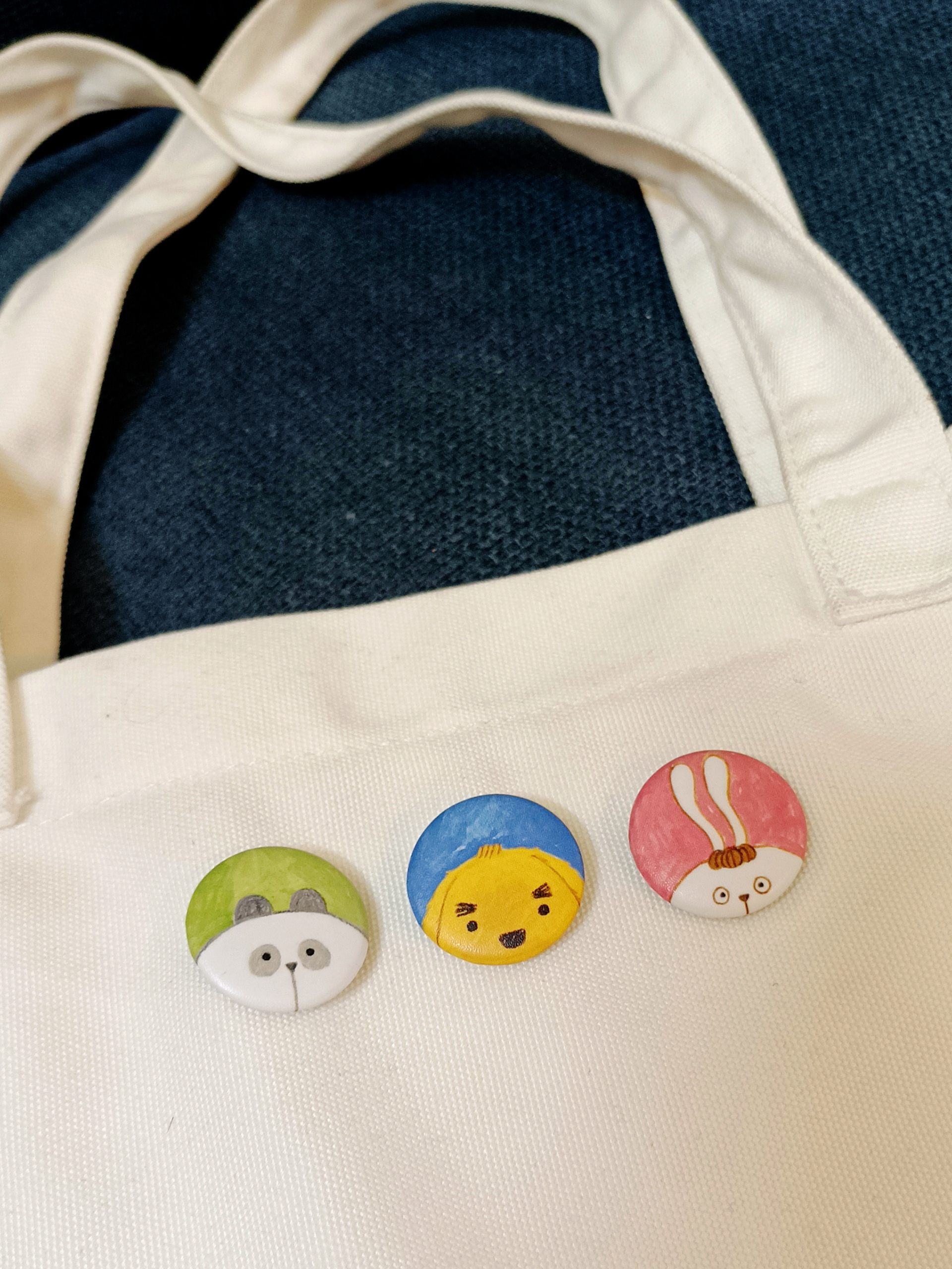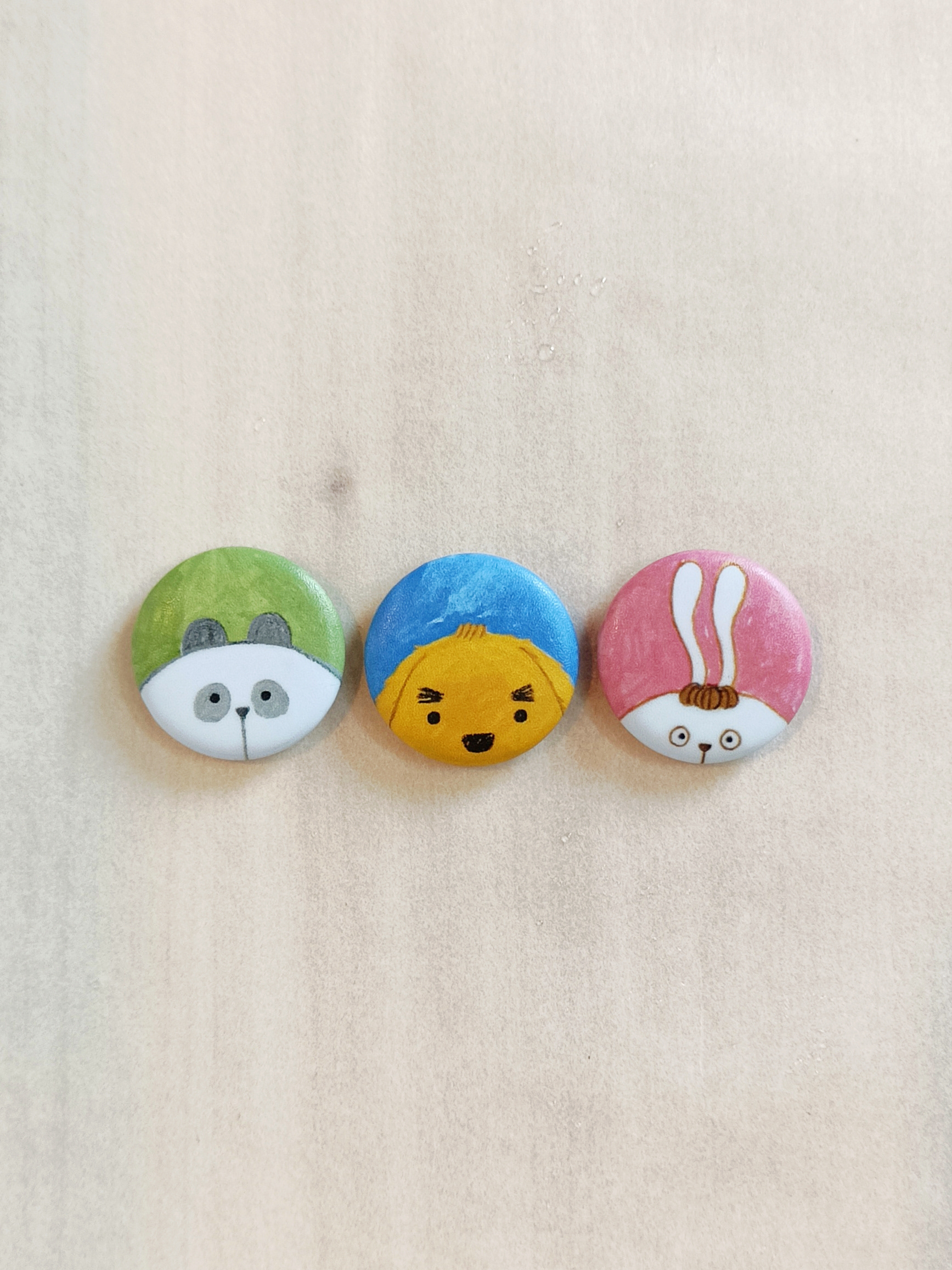 Each piece begins as a hand-drawn illustration on paper, then carefully scanned and printed on high quality paper turned into button pin.